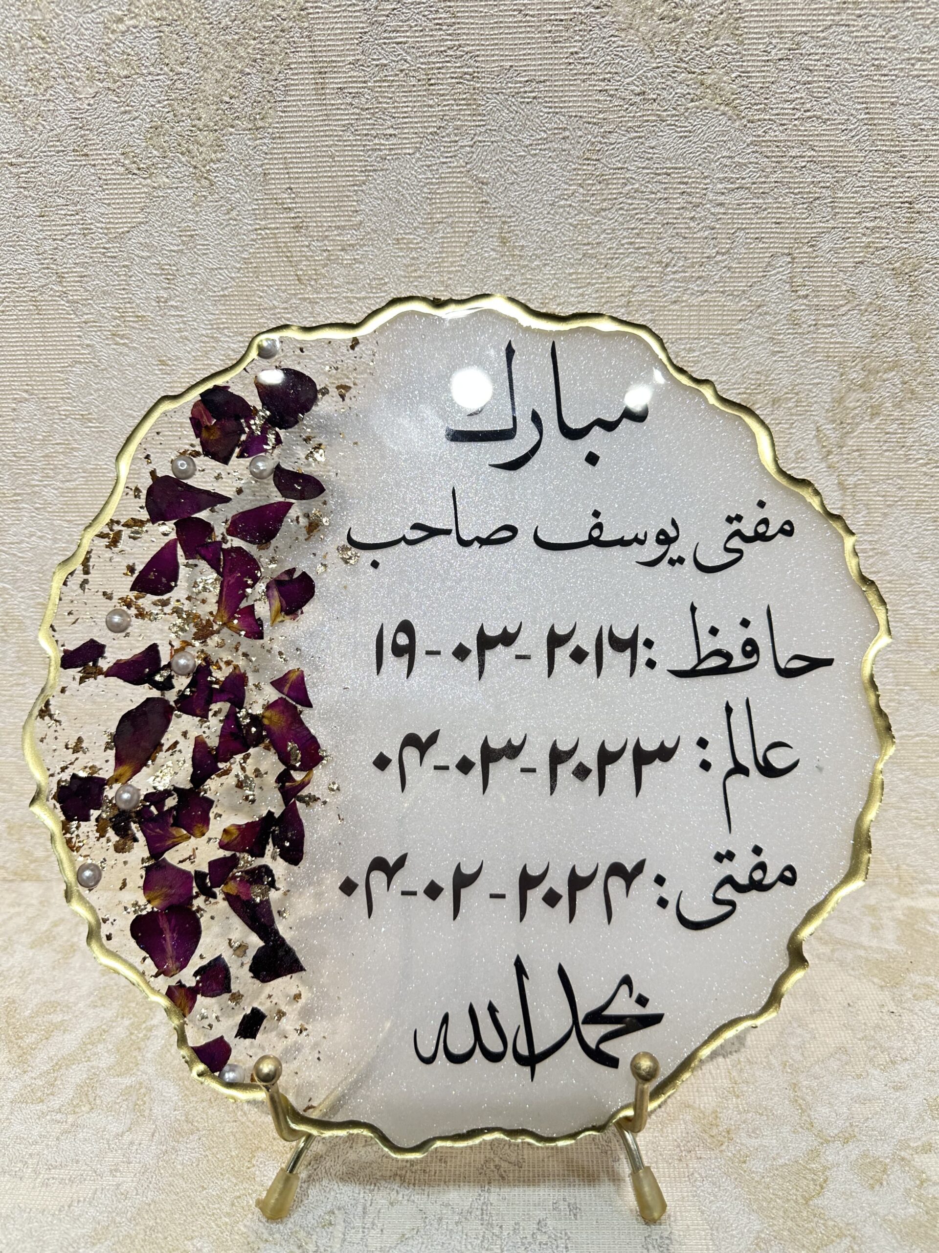 This Islamic resin plaque is a stunning handcrafted piece, designed to honor and celebrate significant achievements in Islamic education and religious milestones. The elegant design features preserved rose petals, delicate pearl embellishments, and gold accents, symbolizing purity and wisdom. The beautifully inscribed Arabic calligraphy adds a personal touch, making it an ideal gift for Hafiz, Aalim, and Mufti graduates, scholars, and teachers.